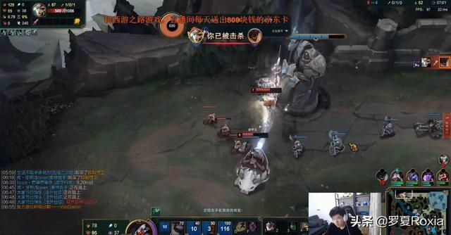 看开了的霸哥也老老实实的。不敢出去补刀了。只能龟缩在塔下。但是瑞文跟了上来。霸哥预言:这个瑞文想越塔杀我;然后霸哥就跟瑞文开始了绕柱。最后还是被瑞文砍死了:就一点办法没有呢?此时霸哥0-3。