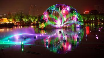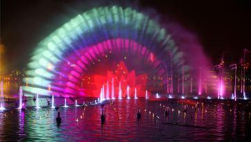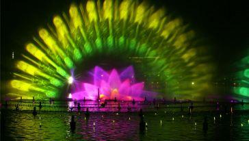 光影落幕。游人仍然可以和水秀互动。将自拍照片传至水幕。共享快乐。