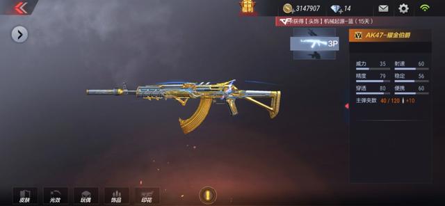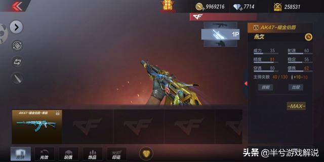 1.首先是消音模式。在射速方面。耀金伯爵的消音模式同火麒麟、黑武士觉醒、沙漠领主一致。相对原版AK大幅度提升了射速。射速的提升使这把AK更具爆发力。耀金伯爵的消音模式换弹速度也是目前AK47中最快的之一。比无影1.34秒的换弹快了很多。它的切枪速度同大多数英雄级AK一致。移动速度相对原版AK有小幅度提升。目前也只有少数英雄级AK提升了移动速度。在载弹量方面。40/130发的备弹同样说明了耀金伯爵顶级AK的定位。