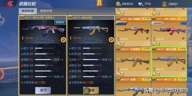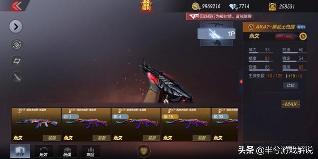 AK47黑武士1.弹夹增长到45发子弹。弹夹容量变大。续航时间更长。2.武器外观略有改变,更华丽的击杀图标和击杀信息