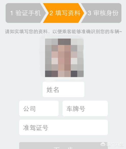 4、注册第二步是填写资料。选择一张自己的免冠照片。然后输入姓名、公司、车牌号、准驾证号。然后点击下一步。