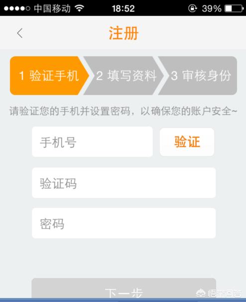 3、注册第一步是验证手机。输入手机号码。点击”验证“。手机收到滴滴短信后。输入验证码。设置登录密码。点击”下一步“。