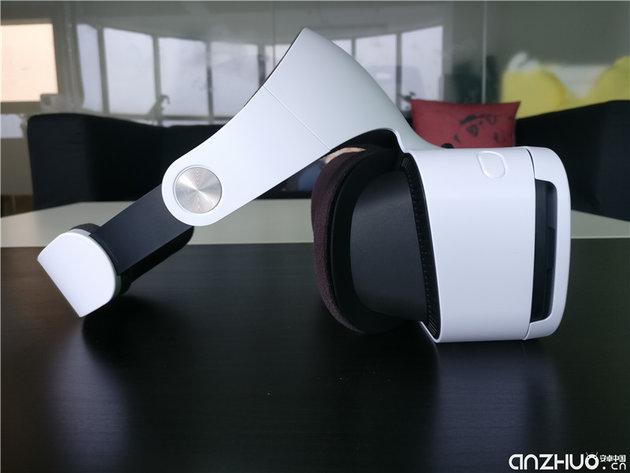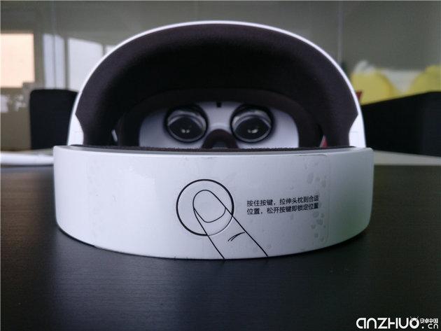 先来看下小米VR眼镜的外观。白色外壳。相比略微“寒碜”的玩具版。新VR眼镜在设计上有质的提升。造型与高端同类产品类似。采用一体化头戴设计、旋转式穿戴结构。即头带部分为环形头箍。头带上有一个按键。通过该按键可以拉伸头枕至合适位置。