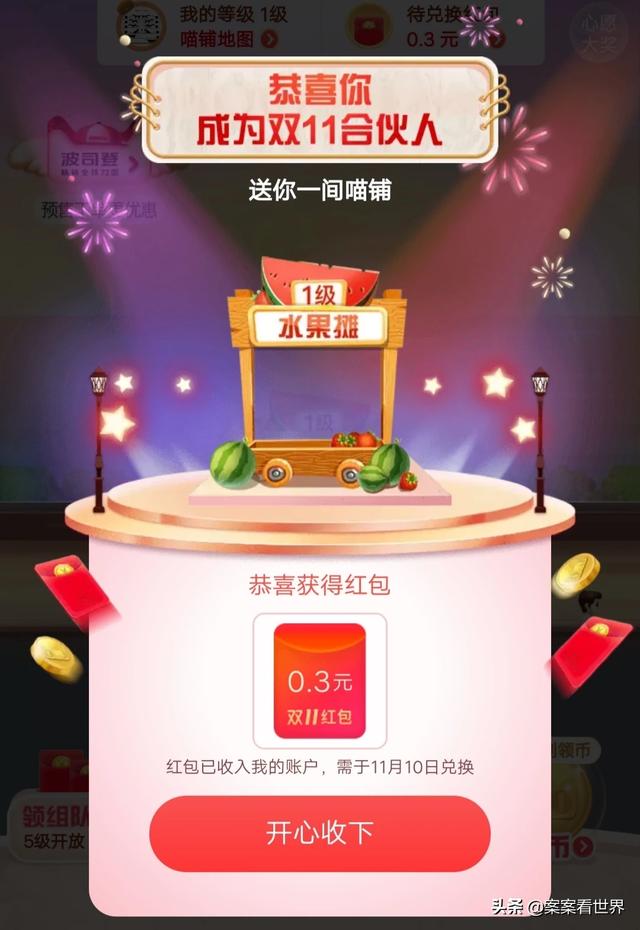 既然是合伙人。那么这个游戏就是当老板。天猫送给你一间喵铺。从一级水果摊做起。京东现在开启的是全民养红包活动。共同瓜分一