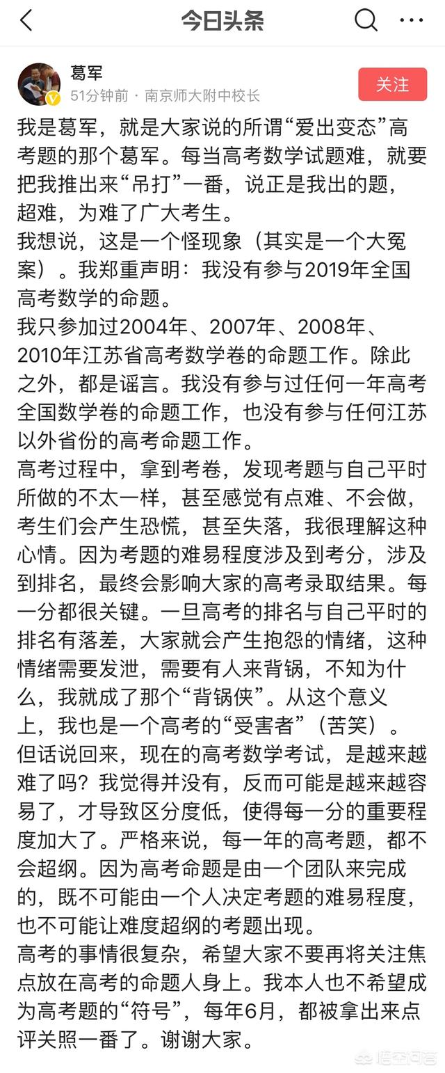 没想到大家都对我们都冤枉葛军了,变态高考数学题不是他出的,你相信葛军“背黑锅”吗?感兴趣,不过这这篇解答确实也是太好了
