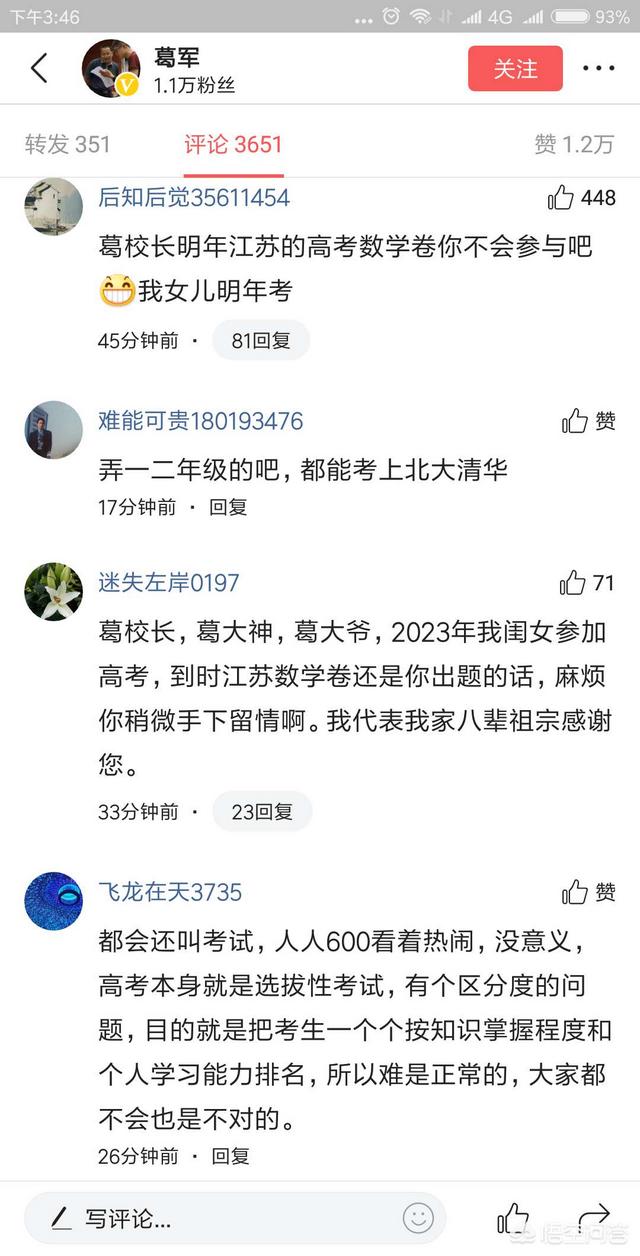 大家第一时间想到的就是葛军老师。因为他多次参加江苏高考数学卷的命题。而恰好这几年大家普遍反映数学考题太难。所以这一次一定还是他。这就是人们的普遍心理定势。因为人们都找不到命题组。也不认识命题组。但人们都认识葛军。都知道葛军。所以是不是他都得是他。于是有人呼出:“葛军出山。一片哀嚎!”这句话的呼出。就像一颗信息原子弹一样。瞬间辐射感染了全国各地。很快复制。衍生。变异出各种各样的信息。风靡网络。无法控制。