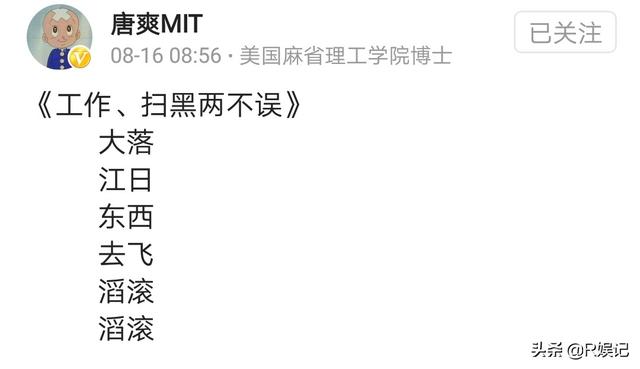 唐爽作为一个科学工作者。现在一边工作。一边打黑扫恶。曾经发表视频。表明了自己坚决打击周立波夫妇黑恶势力的决心。唐爽现在胜券在握。只是时间问题而已。