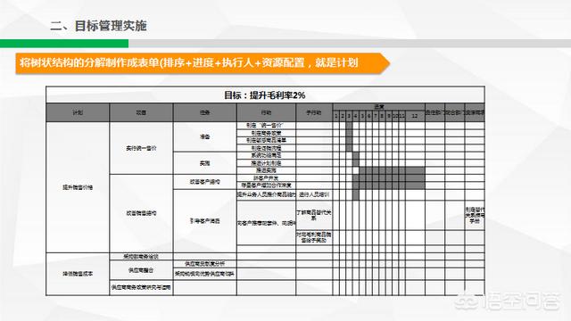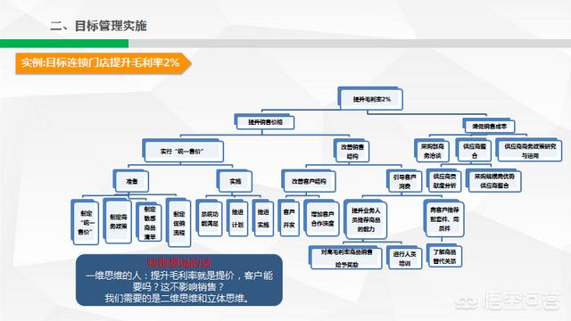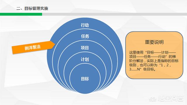 在目标分解过程中常用的方法是“剥洋葱法”或者“树状图法”。总体思想是从大目标一层一层拆分为小目标。在实现目标的时候则是反过来通过实现一个个小目标来达成企业总目标。例如:要实现企业年度目标1.5亿。按季度分每个季度要达成多少。同时结合产品分每个产品系列要达成多少。需要开拓多少新订单。新客户。这样一层一层分解下去。一直最具体的目标。