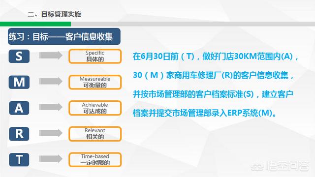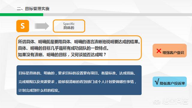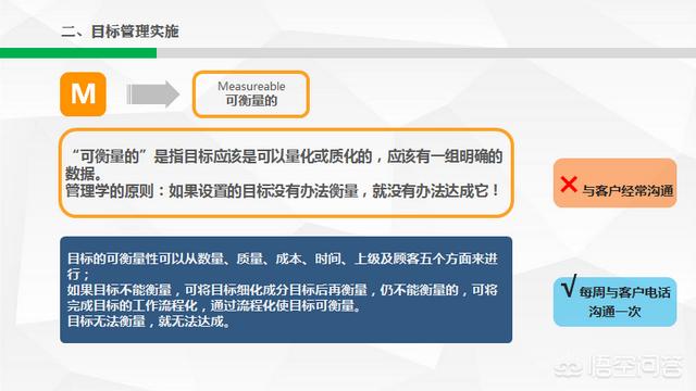 目标的可衡量的:目标要度量。用数字说话。比如今年开拓200个客户而不能说要多开拓客户。