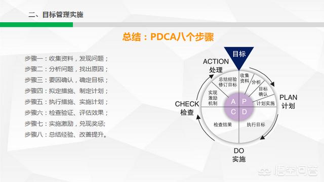 这个方法相信大家不陌生。对于每一个小计划。小目标。在执行的过程中不断的检查达成的效果。发现存在的问题。通过分析找到问题的最根本原因。制定行之有效的改善措施。这个方法在目标管理过程中是不断循环进行的。这一次没有得到解决的问题要循环至下一个PDCA过程中。问题可能需要几次PDCA过程才能彻底解决。
