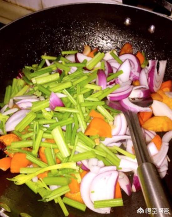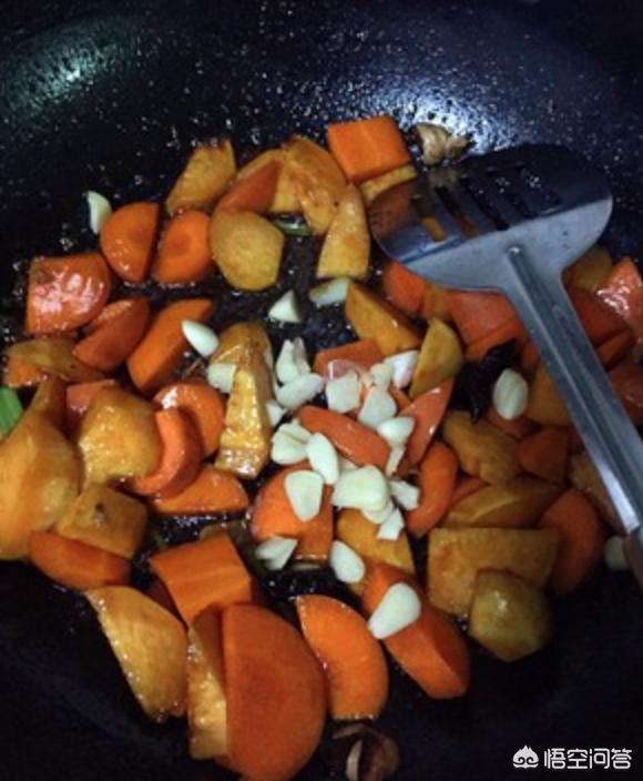 九汤匙蚝油。九汤匙甜面酱。一汤匙酱油。四汤匙番茄酱。搅拌均匀备用。把红薯、胡萝卜切滚刀块。芹菜切段。洋葱切好。大蒜切片。