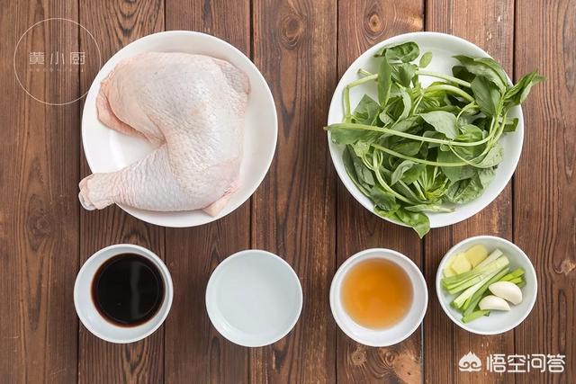 鸡腿洗净剁成小块。小葱切段。姜和蒜切片备用。