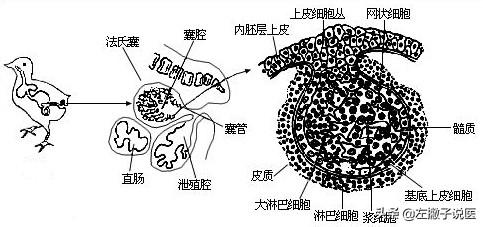 可能大家不太了解法氏囊到底是什么。从本质上来说它就是鸡的免疫器官。在人体内有两种主要的免疫细胞。即B淋巴细胞和T淋巴细胞。人体B淋巴细胞发育、成熟的地方是胸腺和脾。而鸡B淋巴细胞发育成熟的地方就是法氏囊。刚孵化出来的鸡就有法氏囊。随着逐渐成熟。法氏囊逐渐增大。到一定程度以后法氏囊就会逐渐缩小直到消失。不过现在的鸡成长周期短。还没有到法氏囊消失的时候就已经被吃了。