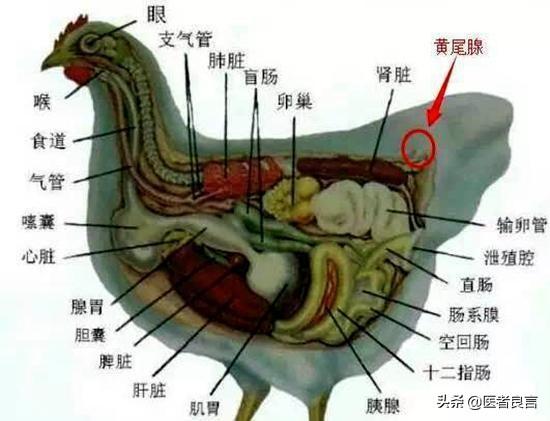 我们可以认真的观察一下鸡屁股。就可以发现。在鸡屁股的背侧有一对称分布的凸起。这个就是鸡屁股上的尾脂腺。也是鸡身上唯一的脂肪性腺体。而鸡屁股上的这个尾脂腺平时会分泌一些油脂(我们用力去挤的话。也会挤出一些油脂分泌物)。而鸡就会通过鸡嘴上面的喙来啄取这些脂肪。用来打扮自己。装饰自己的羽毛。为自己的羽毛上油。从而看上去使鸡的羽毛油亮油亮的。如果家里有养过鸡的人。在平时留心观察的话。就会发现。鸡会时不时喙自己的鸡屁股。之后再整理自己的羽毛。另外还有一个重要的结构腔上囊。这个部位临近鸡直肠的部位。位于鸡直肠的上部。而这里其实就是鸡的体液免疫的中枢淋巴器官。