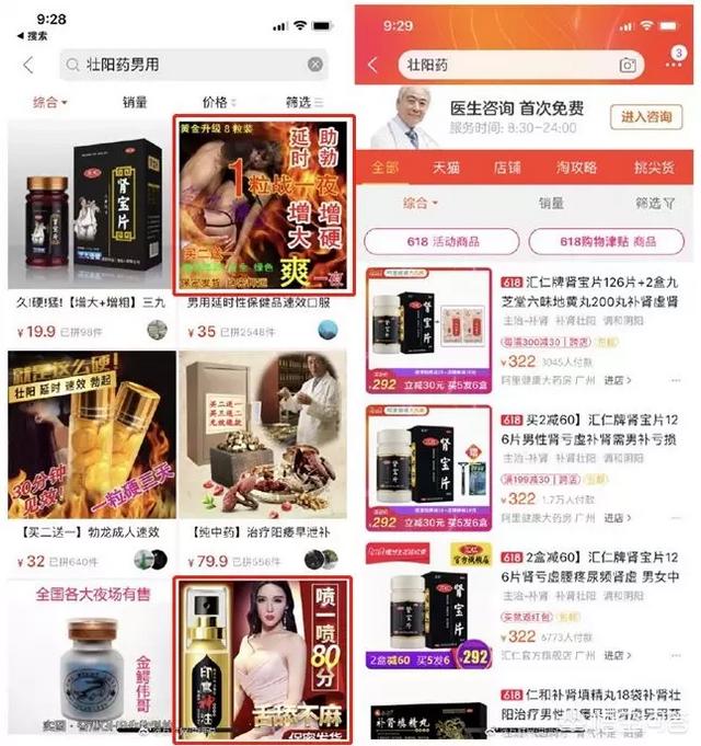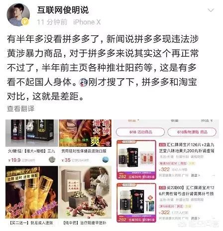 微博网友@互联网俊明说认为这则新闻“对于拼多多来说其实这个再正常不过了。半年前主页各种推壮阳药等。这是有多看不起国人身体。刚才搜了下。拼多多和淘宝对比。这就是差距。 ”