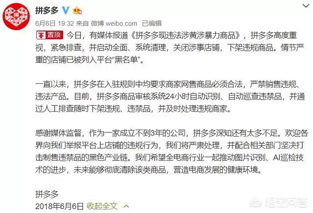 6月6日晚。拼多多发布声明。称已紧急排查。并启动全面、系统清理。关闭涉事店铺。下架违规商品。情节严重的店铺已被列入平台“黑名单”。目前。拼多多商品审核系统24小时自动识别、自动巡查违禁品。并通过人工排查随时下架违规、违禁品。并及时处理违规商家。