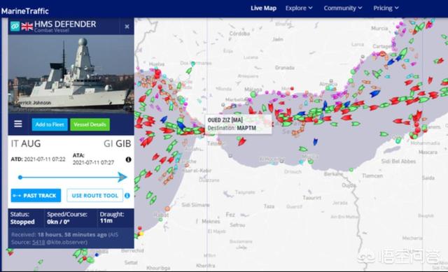 另一艘45型驱逐舰也行踪不定。未能跟随航母打击群行动。据全球AIS船舶动态跟踪数据显示。前些天在克里米亚水域侵入俄罗斯领海挑起事端的英国皇家海军45型“卫士”号导弹驱逐舰(HMS Defender)目前现身直布罗陀海峡。