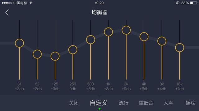 这个东西本身就要看自己喜欢那个频段得自己调节 还要根据耳机啊 均衡器本身就是为了弥补耳机缺陷嘛 比如不通透发闷就调高后面的几个 人声弱就在中间拔高 低音弱就拉前面的 这个别人挑出来的不一定是自己喜欢的 你可以自己试试 我本身也经常弄均衡器 别人给的图 或者音效 试过几个 我就不再相信任何人调节的了 还是自己弄得最适合自己 要是耳机好的话 在调均衡器 那也是浪费