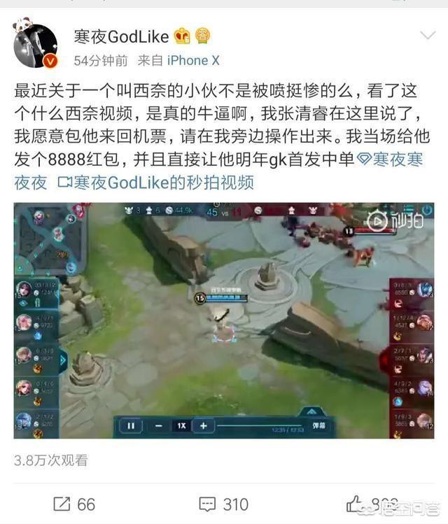 这边王者里的一个主播寒夜也发了微博。说只要能在他面前操作出来给他红包。包他来回机票还让他成为gk得首发中单。