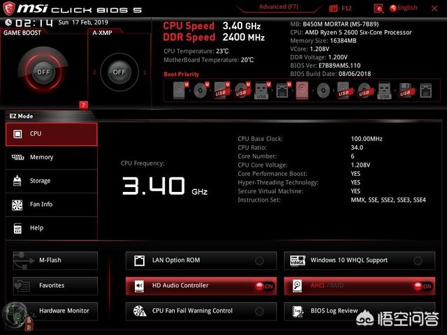 通过进入微星B450迫击炮的BIOS。可以看到内存频率仅为2400MHz。