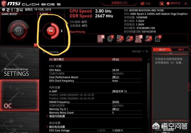 内存的基础频率是2133mhz。需要在bios里开启xmp。然后才会支持到3000mhz。查了一下。迫击炮可以支持3466mhz。所以你只需要开启xmp即可。如图黄色圆圈。而如果你的内存条超频能力好的话。甚至可以通过超频内存提高性能。当然。一般来说不建议超频内存。因为超频内存需要不断给内存加电压。而且带来的性能提升非常有限。所以你目前需要的操作就是进入主板bios开启xmp即可。
