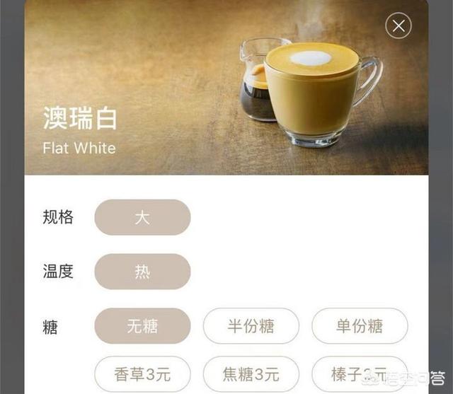 在定制选项上。星巴克一共可以对杯型、温度、低因咖啡或标准咖啡、有无奶泡(只能选去奶泡)。奶的类型和额外的风味糖浆进行选择。