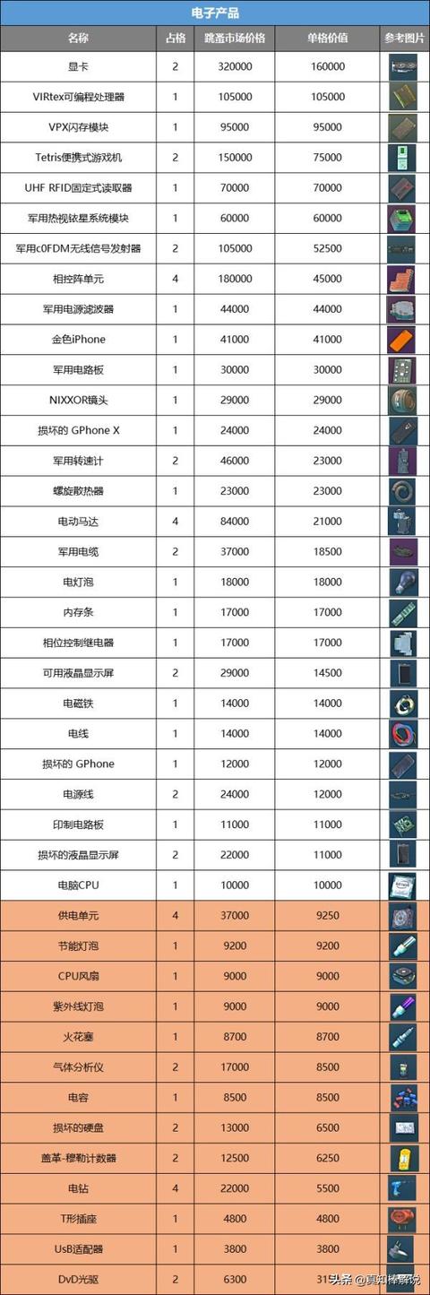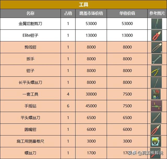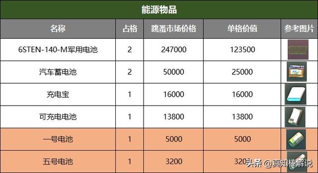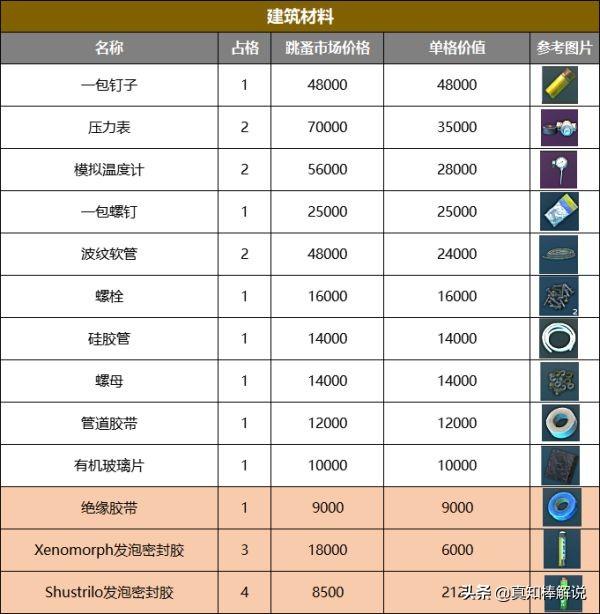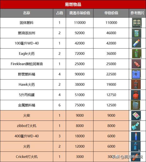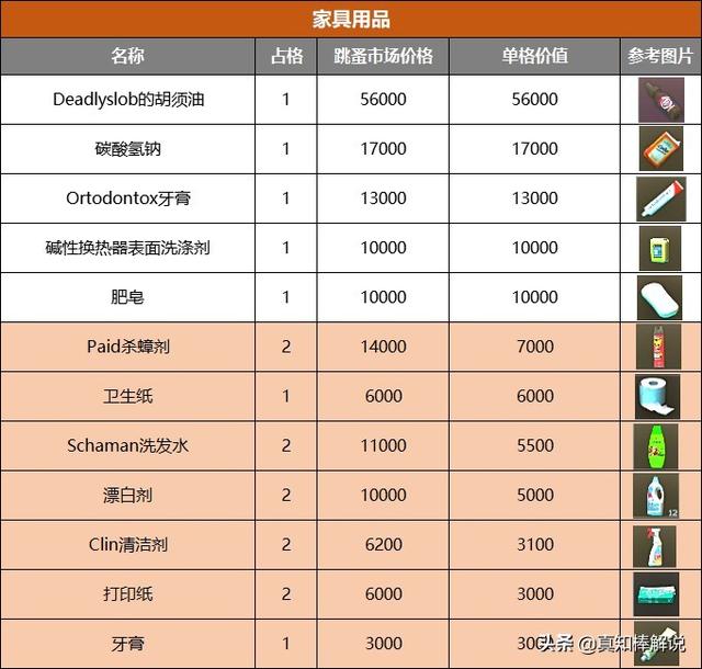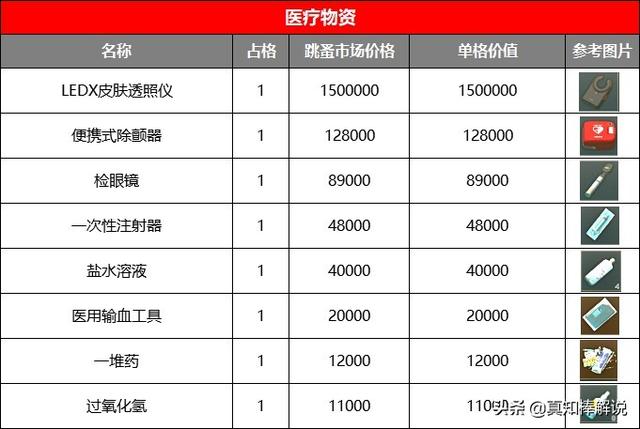 所以我闲着没事就做了一张表。按照物资当前的跳蚤市场价格/物品占用格子数量。算出每件物品的单格价值